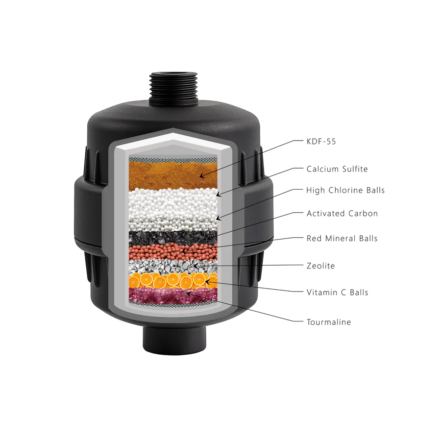 Our Shower Filters have multi-stage filtration. Not only do they filter out the nasties, but they also infuse the water with beneficial minerals and Vitamin C.